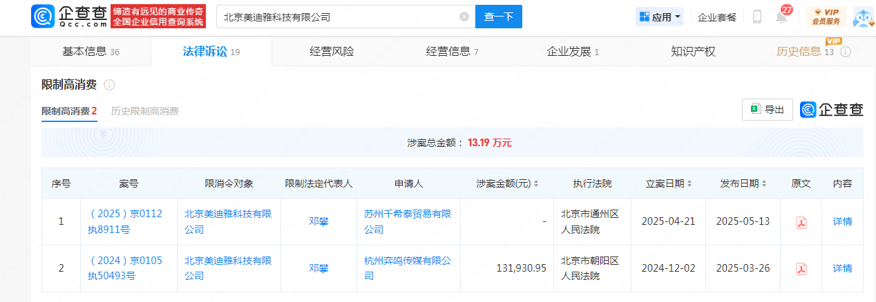 根据企查查,王璞间接控股公司北京美迪雅科技有限公司因2025年3月及5月发布的两则诉讼涉案13.2万元被限制高消费;4月还有一则1万元的被执行人案件。该公司子公司北京创荟科技有限公司也被列入失信被执行人、被执行人及限制高消费。